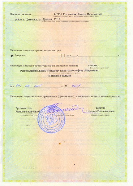 • Места осуществления образовательной деятельности по дополнительным профессиональным программам: Ростовская область, г. Цимлянск, ул. Донская дом 37/10